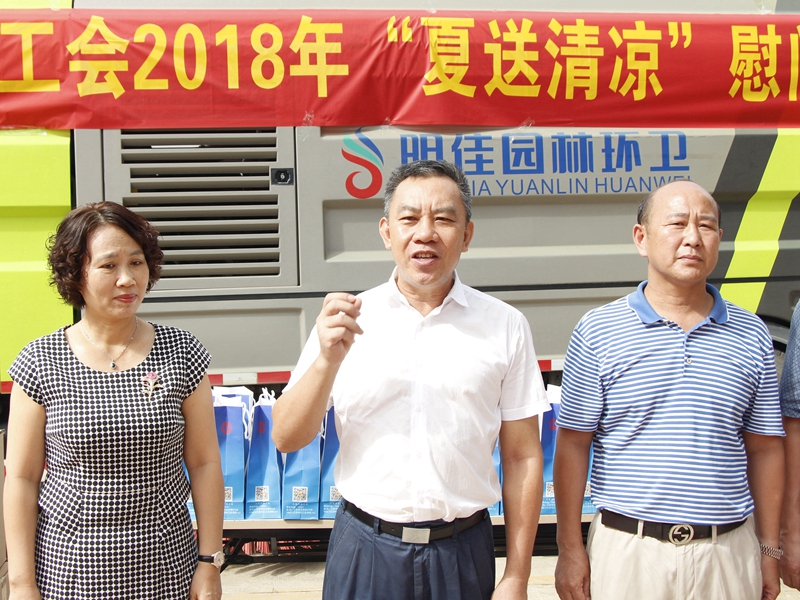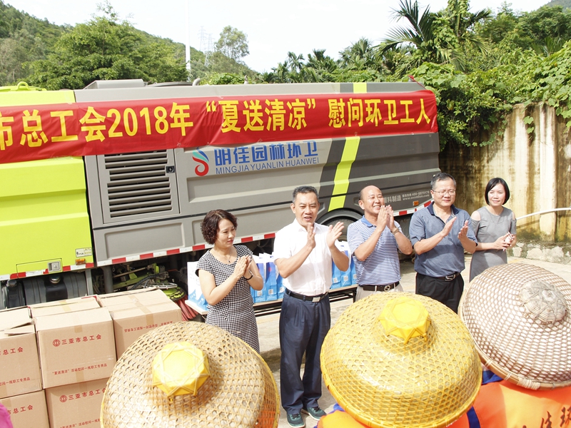 “你們辛苦了!感謝你們?yōu)槿齺喪忻瘛⒂慰蛣?chuàng)造了一個(gè)干凈整潔的人居環(huán)境,為三亞市“創(chuàng)文鞏衛(wèi)”工作作出的突出貢獻(xiàn)。”。張羽飛代表三亞市總工會(huì)向集團(tuán)公司全體職工致以親切的慰問(wèn)。他指出,環(huán)衛(wèi)工人頭頂列日,揮灑汗水,以“寧愿一人臟,換來(lái)萬(wàn)家凈”的精神,為靚扮鹿城、建設(shè)國(guó)際化熱帶濱海旅游精品城市提供衛(wèi)生保障。他勉勵(lì)大家繼續(xù)發(fā)揚(yáng)三亞環(huán)衛(wèi)人的精神,勇當(dāng)尖兵的決心,提高環(huán)衛(wèi)作業(yè)質(zhì)量,在三亞市社會(huì)文明大行動(dòng)和新一輪“創(chuàng)文鞏衛(wèi)”工作中作出新的更大貢獻(xiàn)。