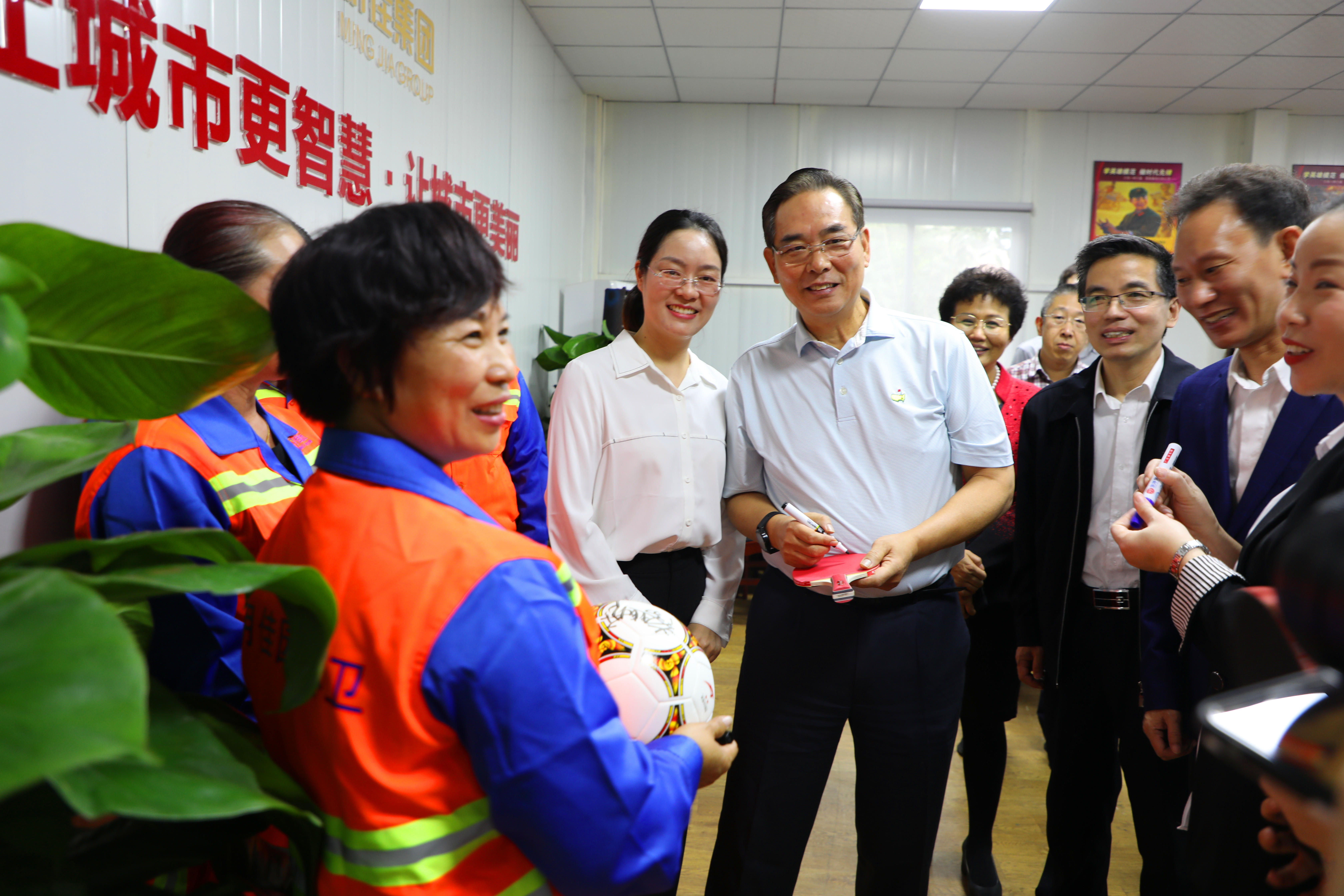 他肯定了明佳集團(tuán)工會(huì)取得的成績,并親切慰問了現(xiàn)場的環(huán)衛(wèi)工人,與他們一一握手,并合影留念。