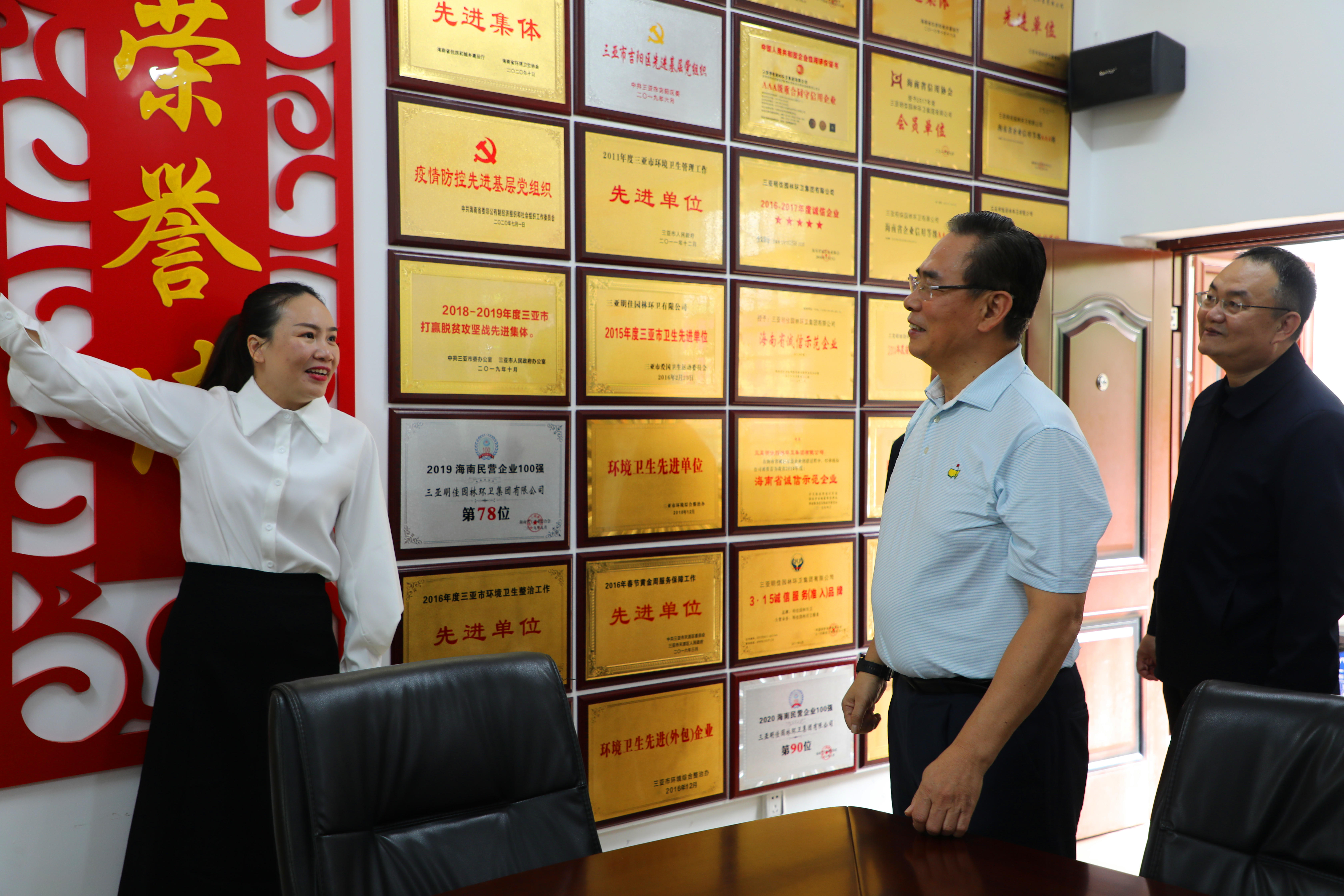 蔡副主席一行來到明佳集團(tuán)職工之家,工會(huì)主席高斐斐介紹職工書屋由三亞市總撥專款、集團(tuán)黨支部共同出資建立,現(xiàn)藏書一千余冊,并配備投影儀、電腦、電子閱覽器等設(shè)備,蔡副主席對職工書屋的建設(shè)表示了充分的肯定。來到企業(yè)榮譽(yù)墻面前,高斐斐介紹了近期工會(huì)工作取得的海南省工人先鋒號(hào)等榮譽(yù),蔡副主席對工會(huì)取得的成績表示了極大的贊賞。