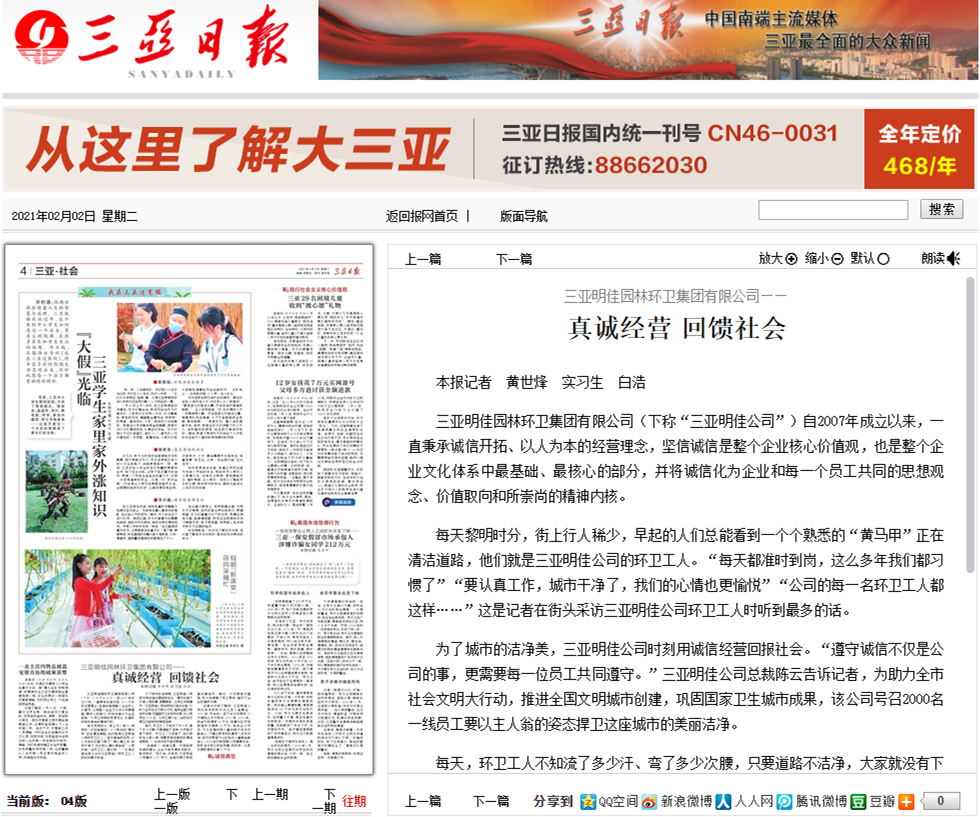 三亞明佳園林環(huán)衛(wèi)集團(tuán)有限公司(下稱“三亞明佳公司”)自2007年成立以來(lái),一直秉承誠(chéng)信開拓、以人為本的經(jīng)營(yíng)理念,堅(jiān)信誠(chéng)信是整個(gè)企業(yè)核心價(jià)值觀,也是整個(gè)企業(yè)文化體系中···